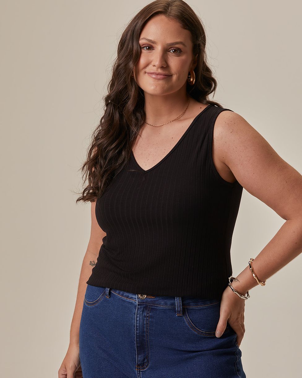 Regata Básica Feminina Plus Size Decote V Em Canelado De Viscose