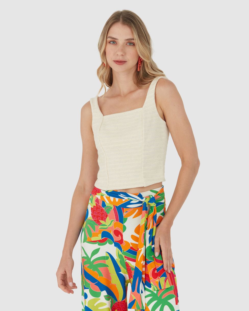 Regata feminina confeccionada em malha tweed. Apresentando modelagem Cropped, super moderna com comprimento mais curto, feito para mostrar a cintura e caimento mais ajustada ao corpo, essa peça em malha tweed texturizada possui alças medianas, decote quadrado e recorte duplo no frontal. Uma blusa moderna e estilosa para complementar o visual. Combine com calça em tecido Malwee, sandália baixa e bolsa tiracolo para um visual descontraído.