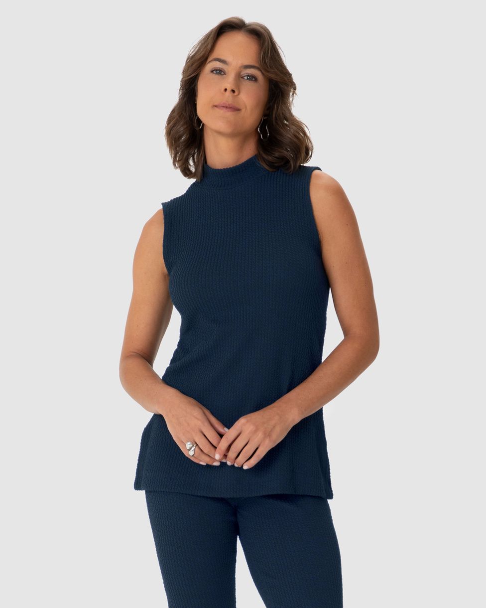 Regata Feminina Alongada Gola Alta Fenda Lateral Em Malha Texturizada