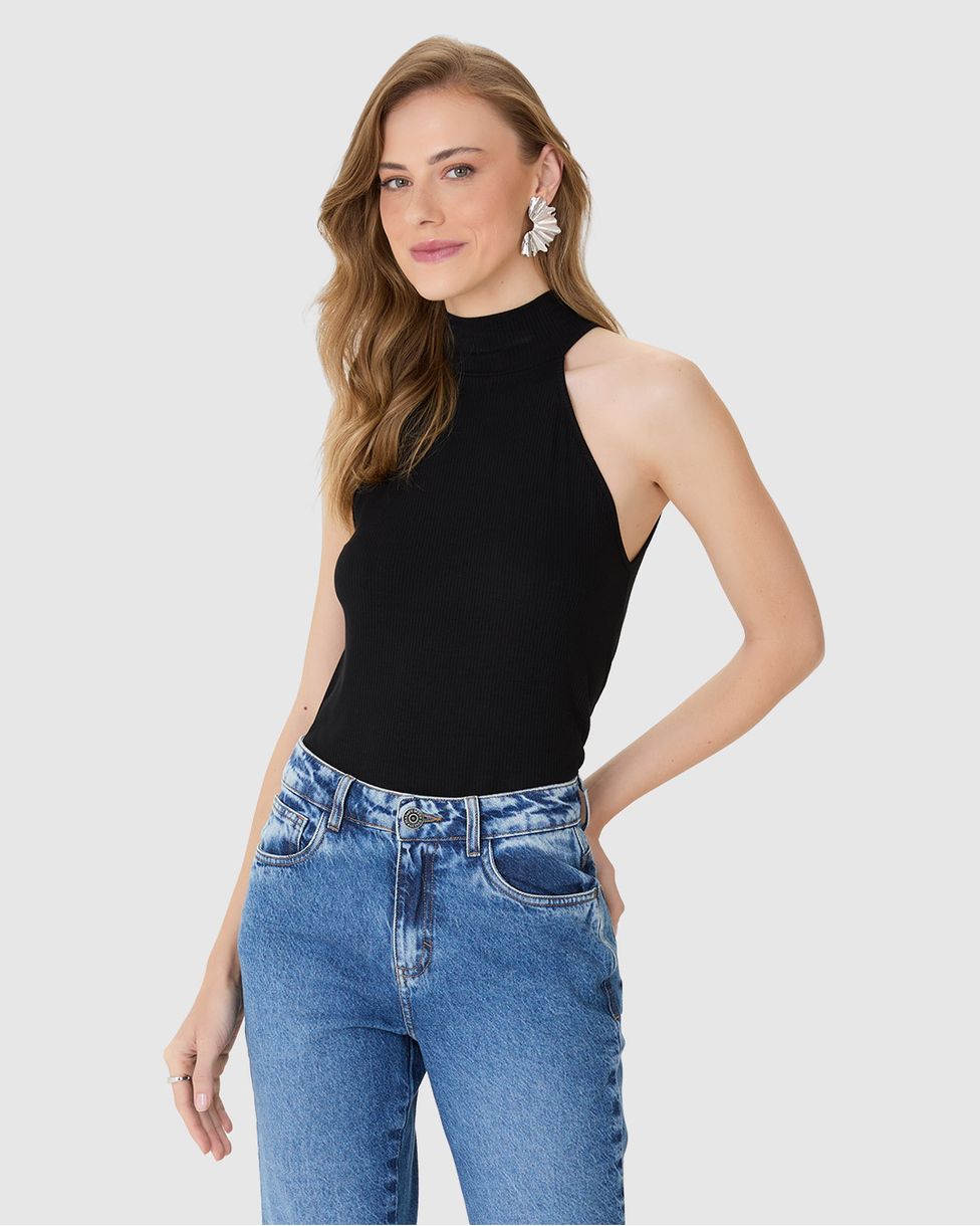 Regata Feminina Evasê Gola Alta Cavada Em Malha Viscose Canelada