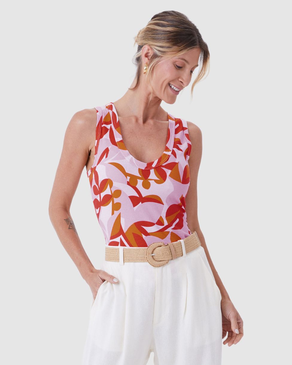 Regata Feminina Folhagem Decote V Alça Larga Em Malha Viscose Canelada