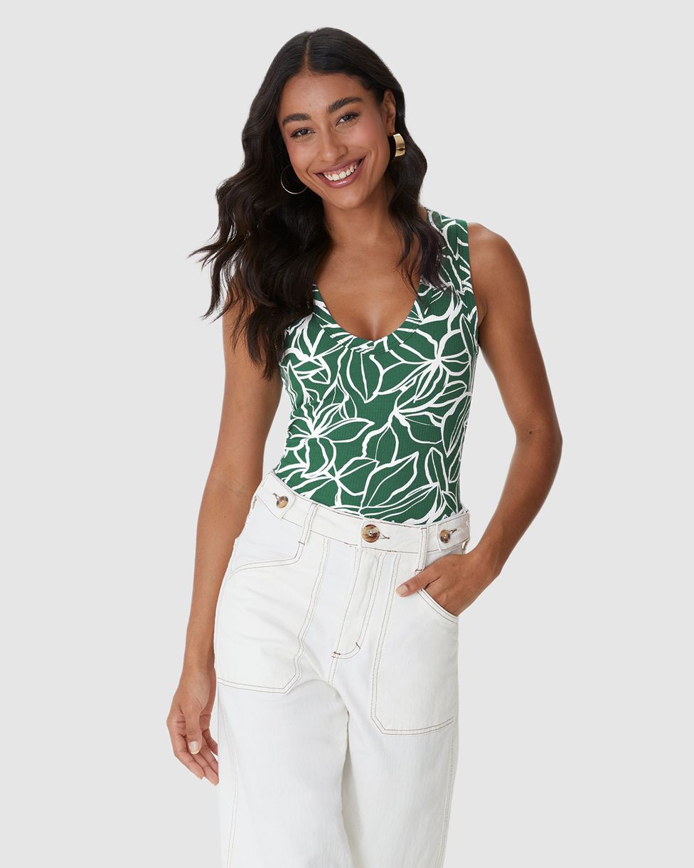 Regata Feminina Folhagem Decote V Alça Larga Em Malha Viscose Canelada