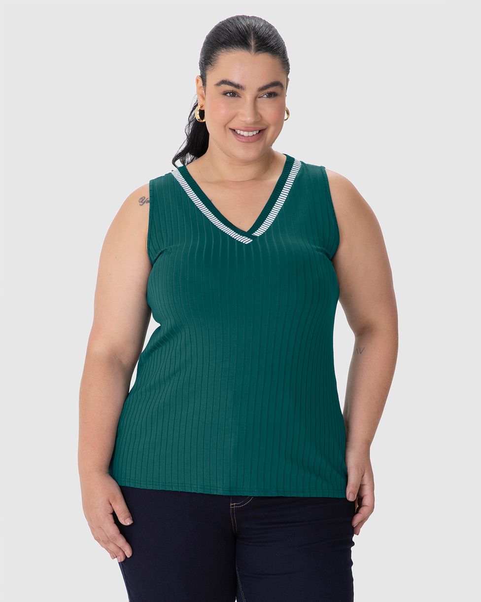 Regata Feminina Plus Size Decote V Retilínea Em Malha Viscose Canelada Verde - G5