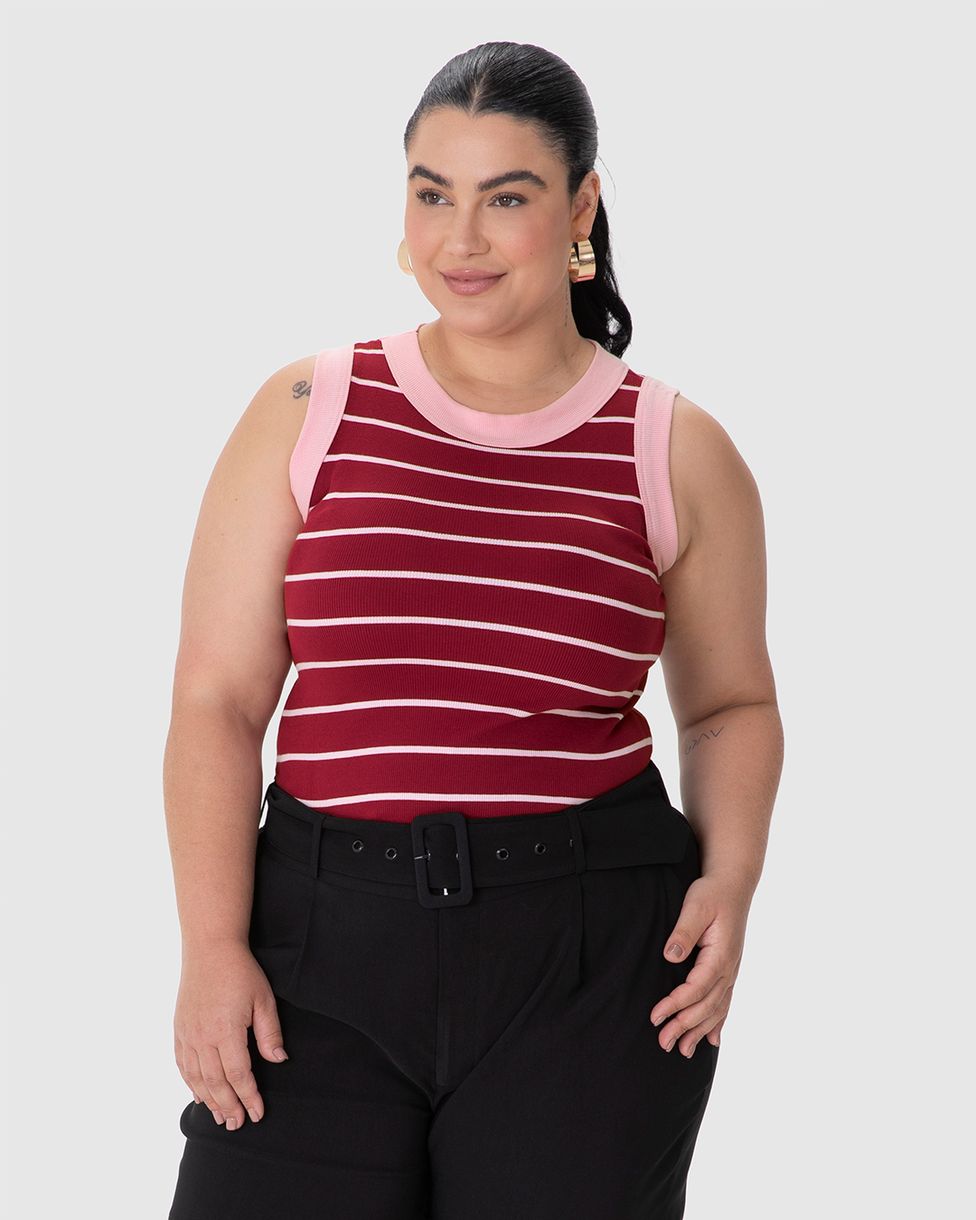 Regata Feminina Plus Size Justa Costura Contraste Em Ribana Listrada Vermelho - G4