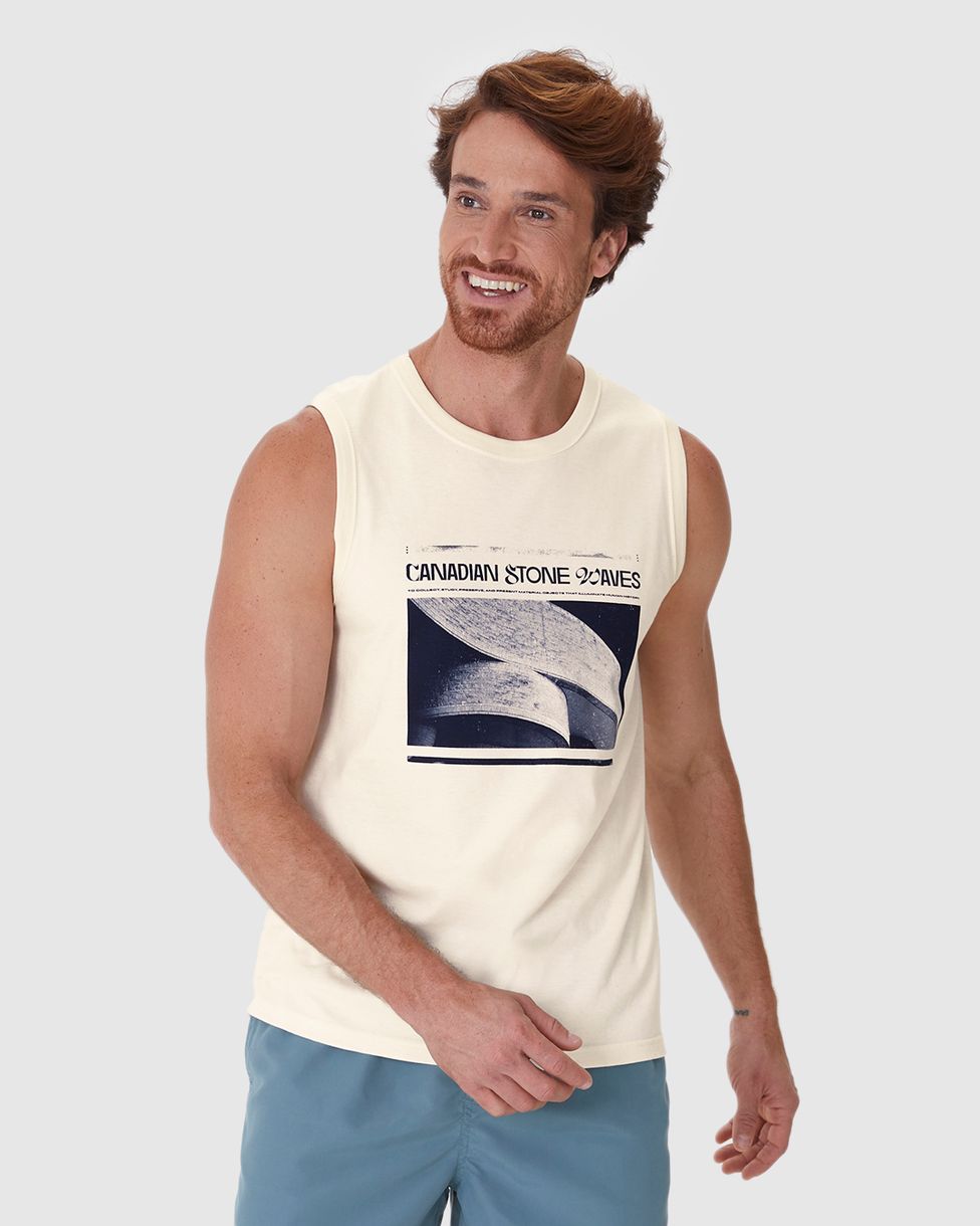 Regata Masculina Decote Redondo Alça Larga Estampa Frontal Em Algodão Off White - G