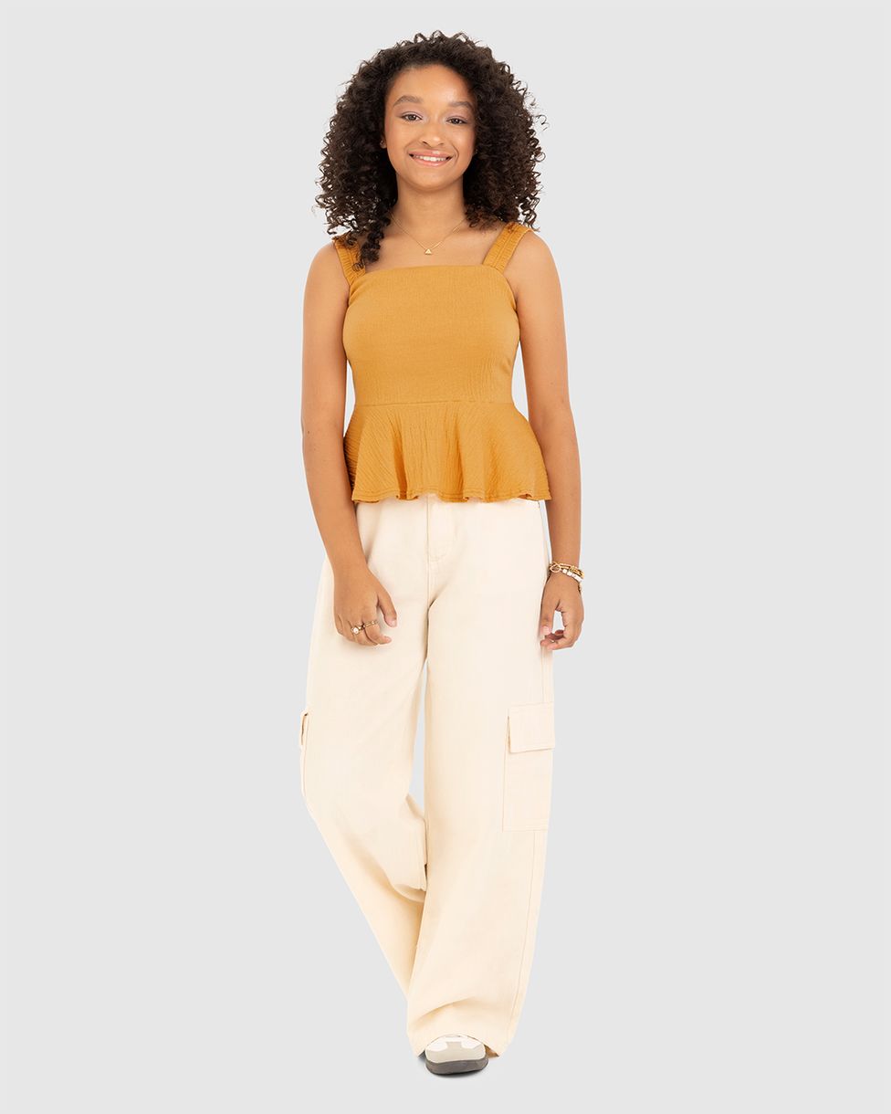 Regata Menina Peplum Em Malha Texturizada Malwee Kids: sofisticação e leveza para o dia a dia das jovens! Com modelagem peplum, essa peça oferece um toque feminino e moderno. Feita em malha texturizada, garante conforto e estilo, tornando-se ideal para compor looks delicados e versáteis.