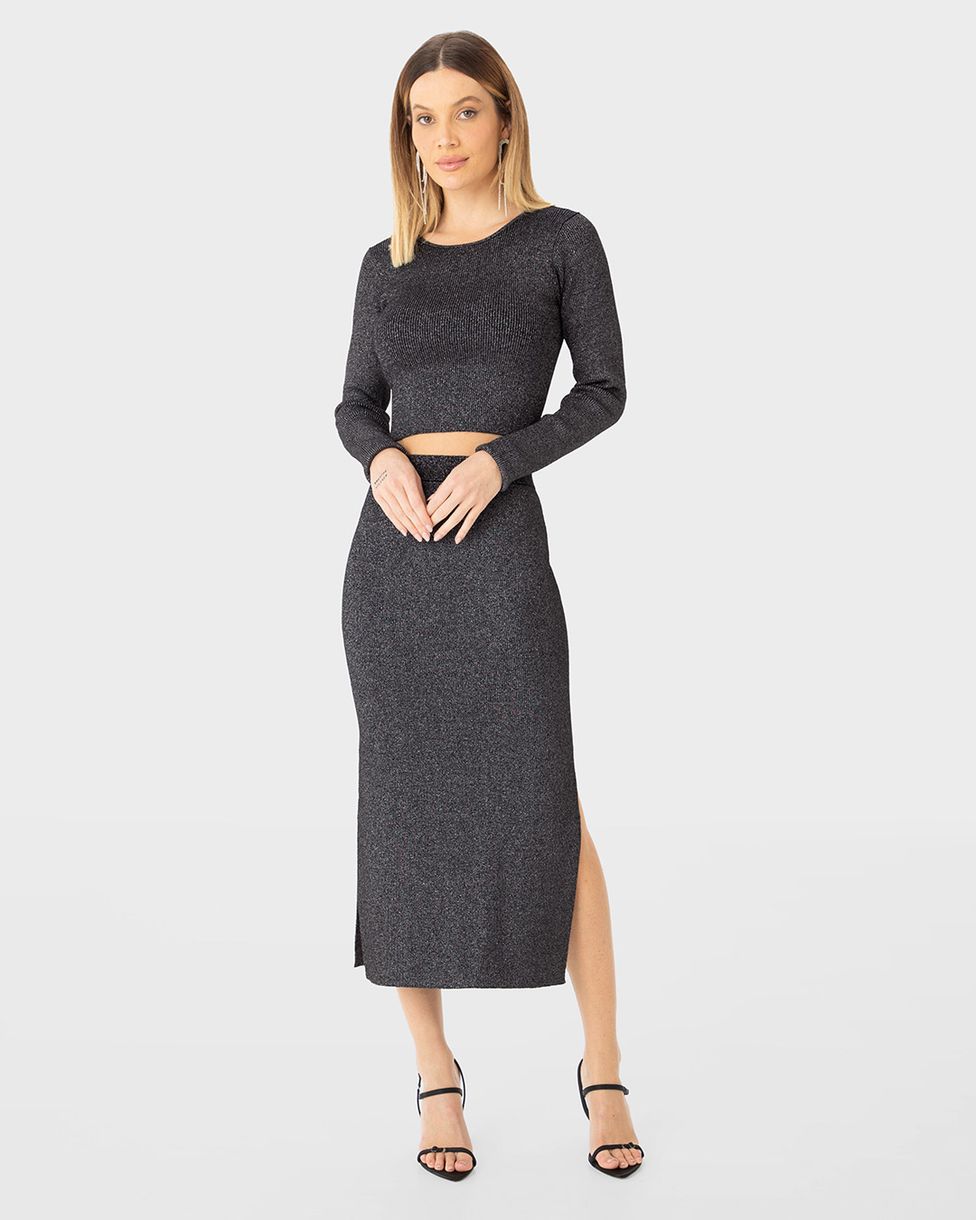 Saia Lápis Feminina Fenda Lateral Em Tricô Metalizado - ENFIM