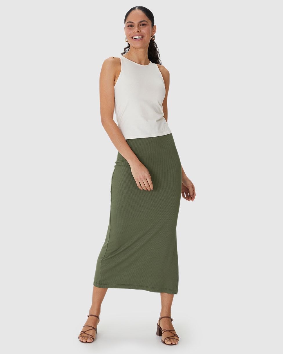 • Saia midi básica em malha viscose canelada