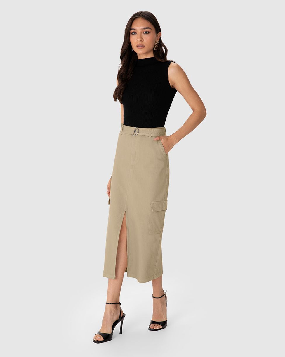 Saia Midi Feminina Cargo Cintura Média Em Sarja Stretch - ENFIM