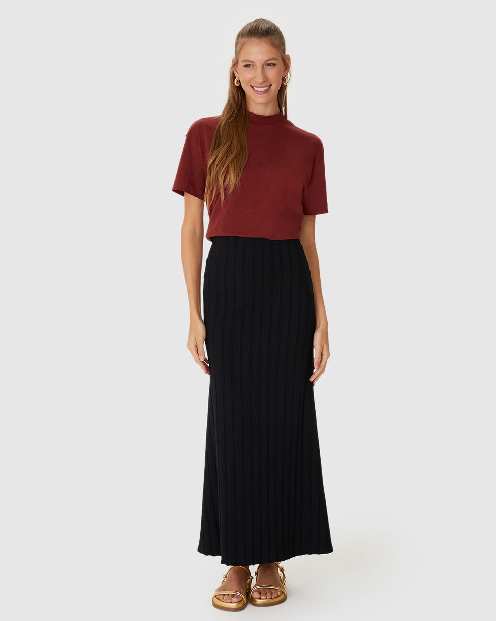 Saia Midi Feminina Evasê Cintura Alta Em Malha Viscose Canelada