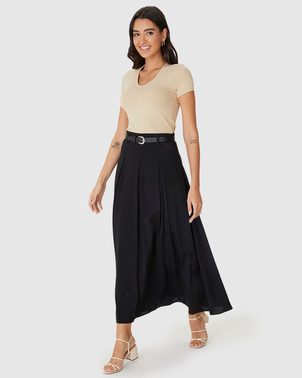 Saia Midi Feminina Evasê Com Cinto Em Liocel