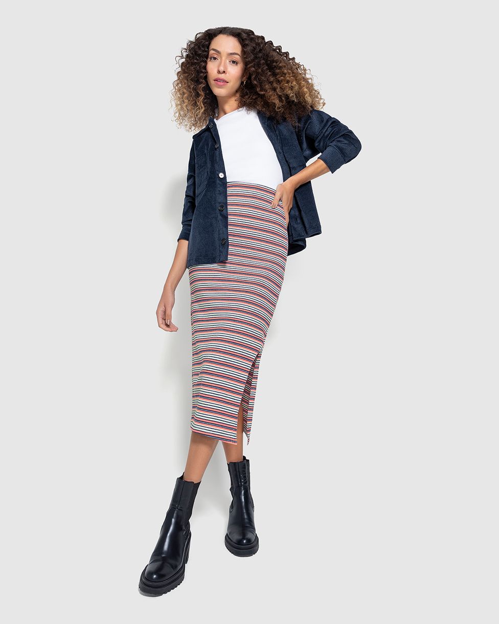 Saia Midi Feminina Fenda Lateral Em Malha Listrada - ENFIM