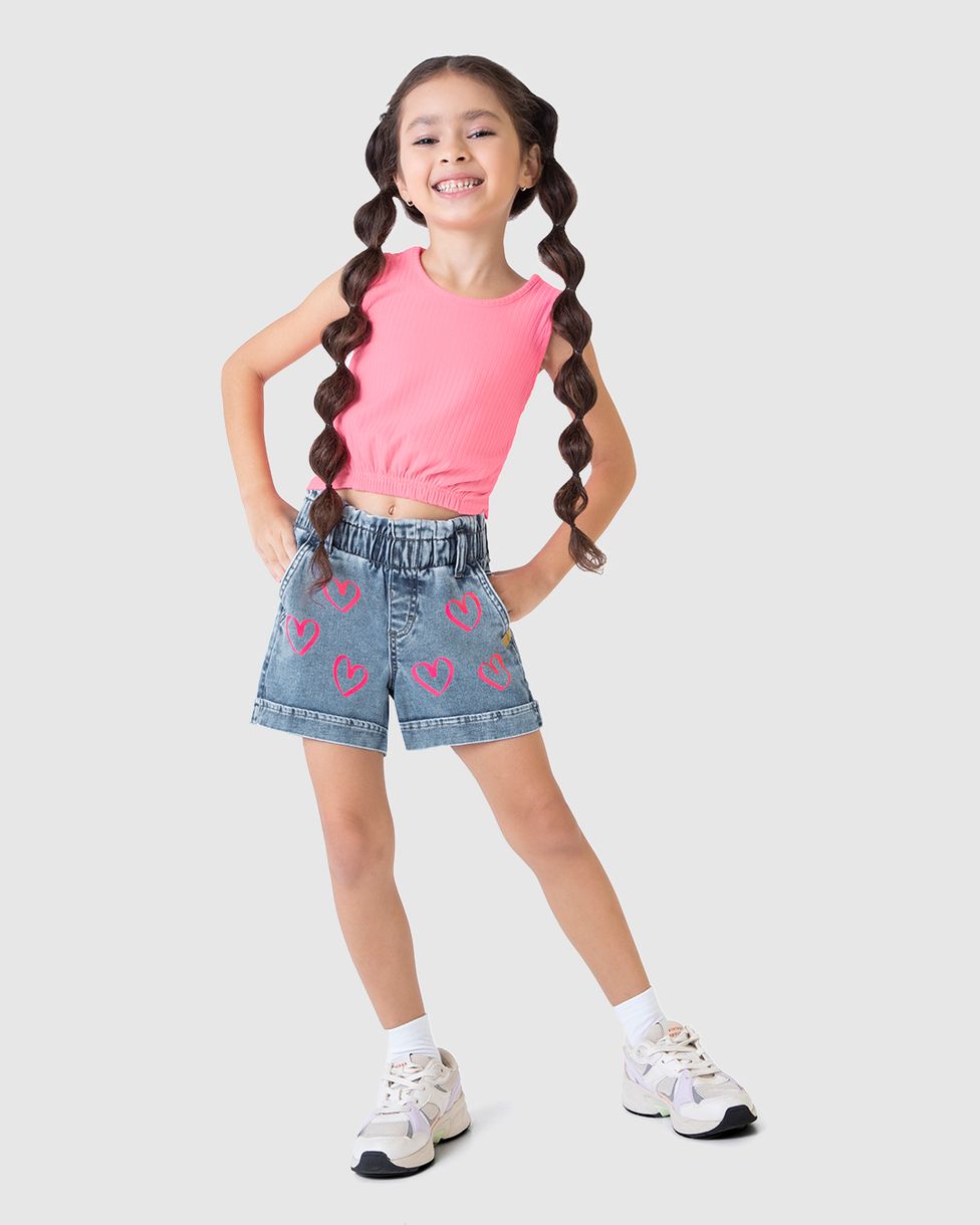 Shorts Infantil Menina Desenho Corações Em Jeans Moletom Malwee Kids