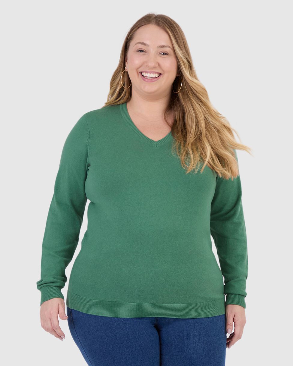 Suéter Básico Feminino Plus Size Gola V Em Tricô