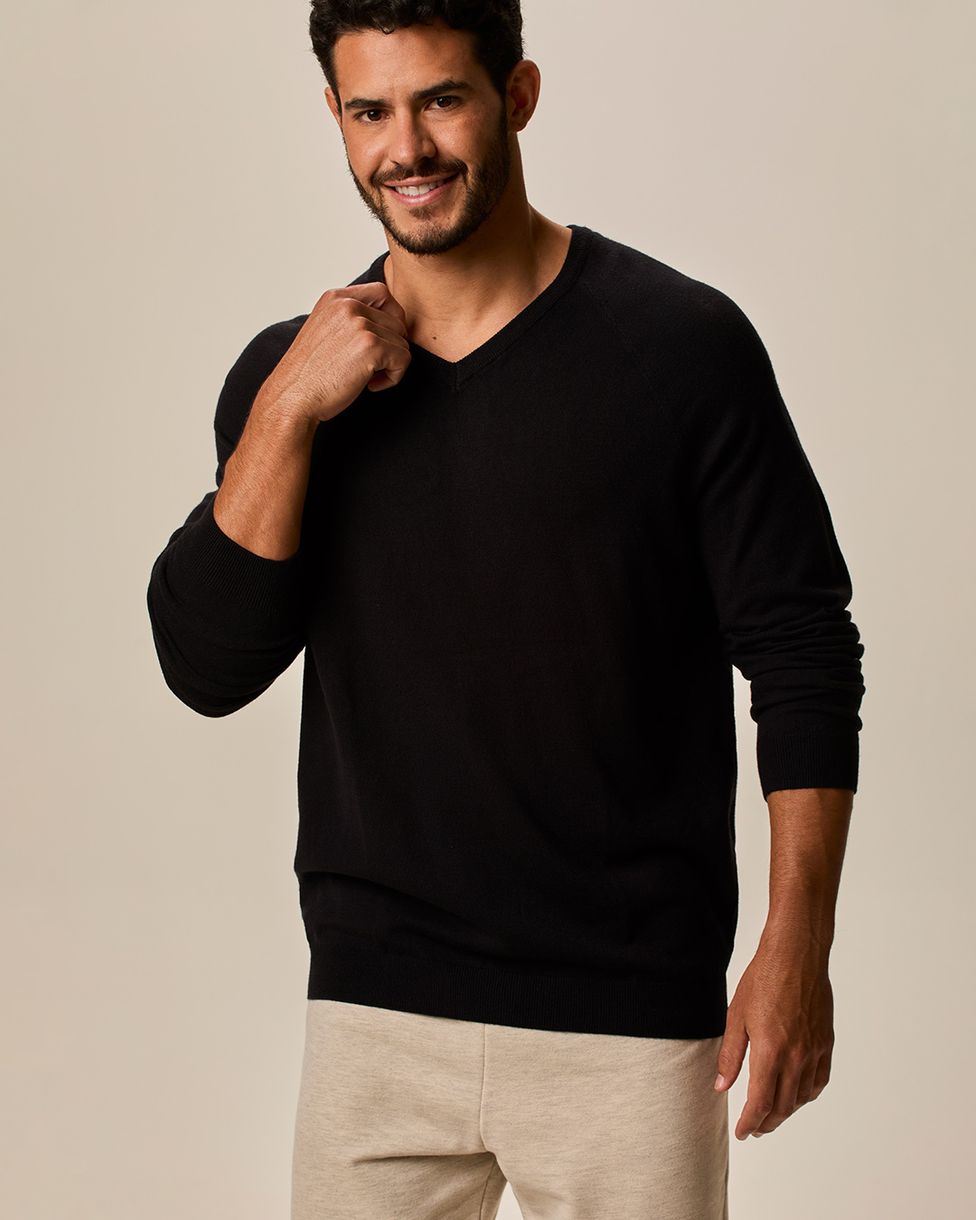 Suéter Masculino Gola V Manga Longa Em Tricô Preto - XGG
