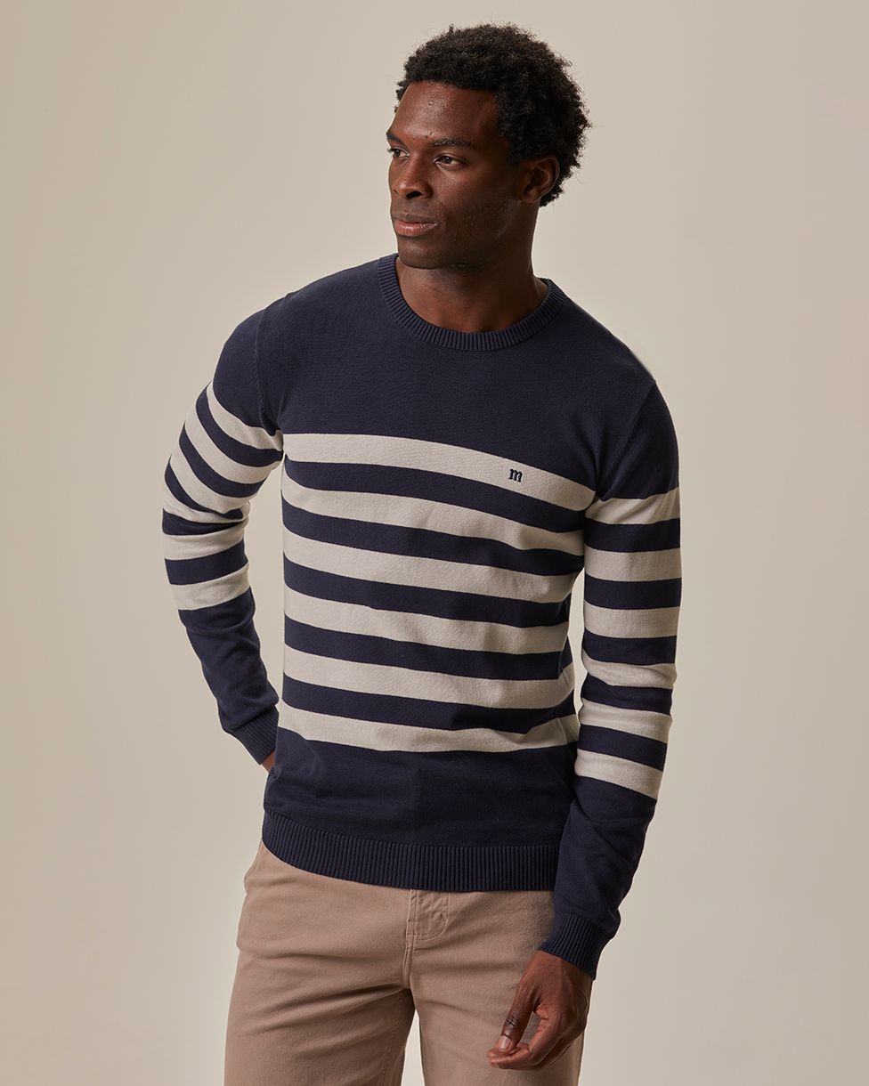 Suéter Masculino Listrado Bordado Peitoral Em Tricô
