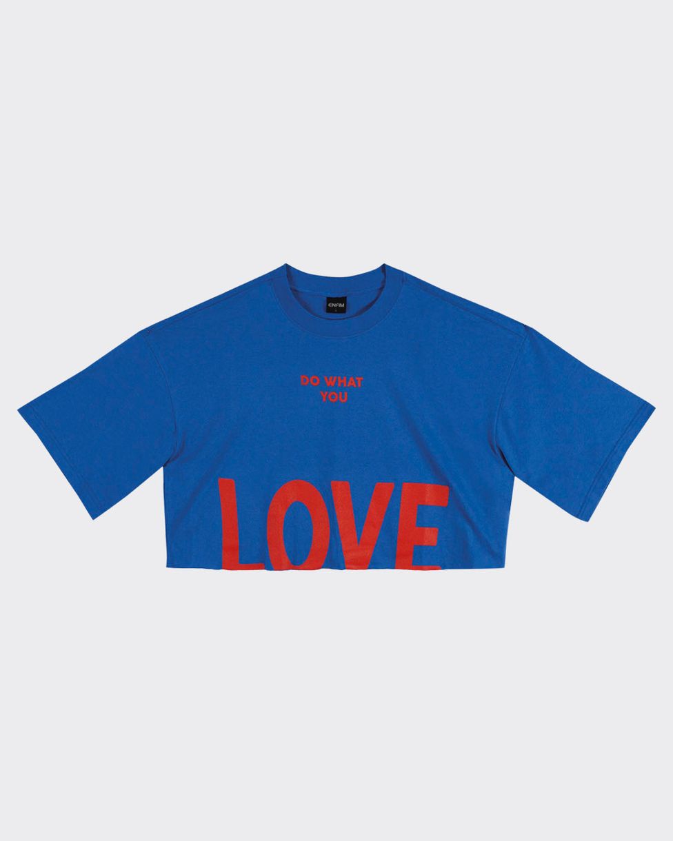 A T-Shirt Cropped, possui comprimento mais encurtado e feito para mostrar a cintura, ela também conta com gola redonda, mangas curtas e estampa frontal lettering "Do What You Love: Faça O Que Você Ama". Ideal para os looks do dia a dia, use com mom jeans Enfim!