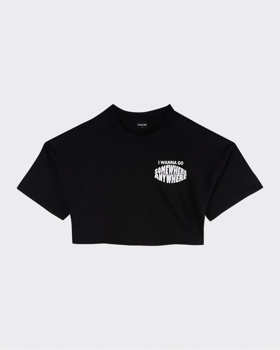 A T-Shirt Cropped, possui comprimento mais encurtado e feito para mostrar a cintura, ela também conta com gola redonda, mangas curtas e estampa frontal lettering "I wanna go somewhere anywhere: Quero ir a qualquer lugar". Aposte com shorts Enfim e bota tratorada!