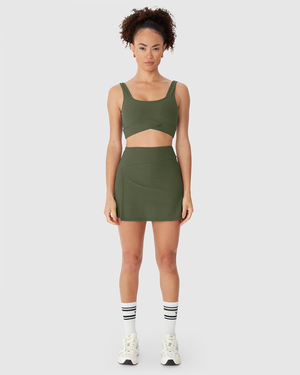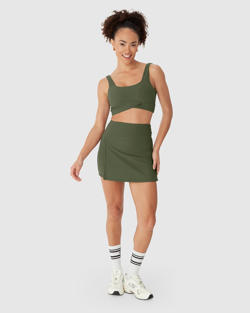 • Modelagem ajustada com cós transpassado que valoriza o corpo