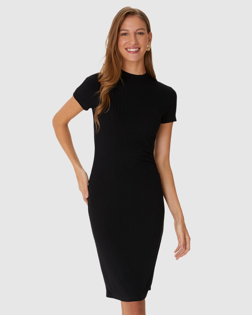Vestido Básico Feminino Gola Alta Em Malha Canelada De Viscose