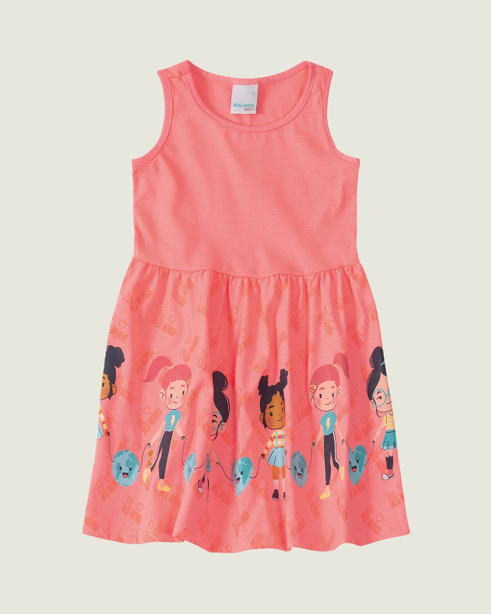 Vestido confeccionado em meia malha. Modelo godê, possui saia rodada que fará sua pequena se sentir uma princesa. Estampa de meninas brincando de ciranda. Para um look moderno e cheio de conforto, aposte em tênis branco de caninho e um óculos de sol colorido para alegrar ainda mais o visual!