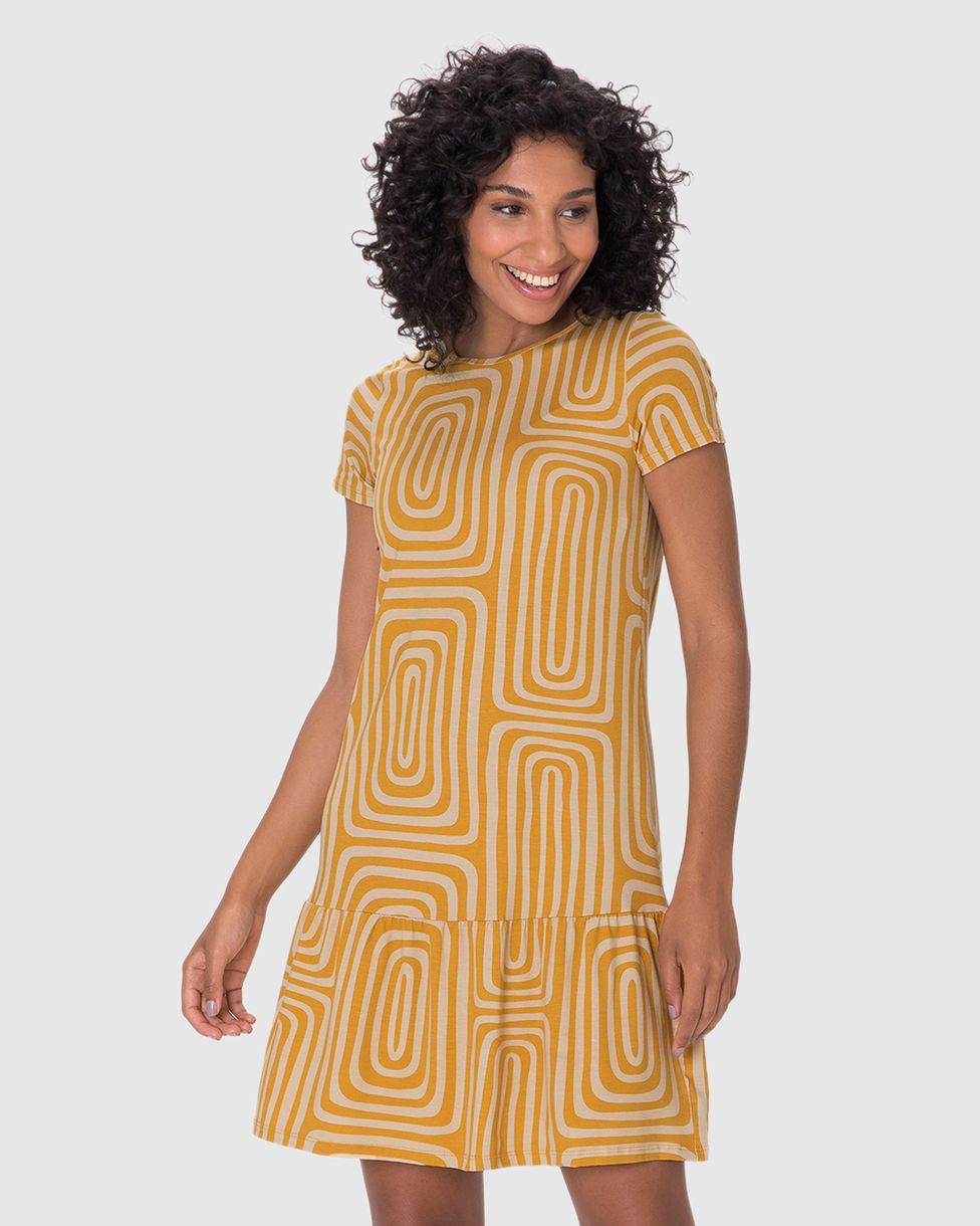 Vestido Feminino Evasê Estampado Barra Franzida Em Viscose Stretch