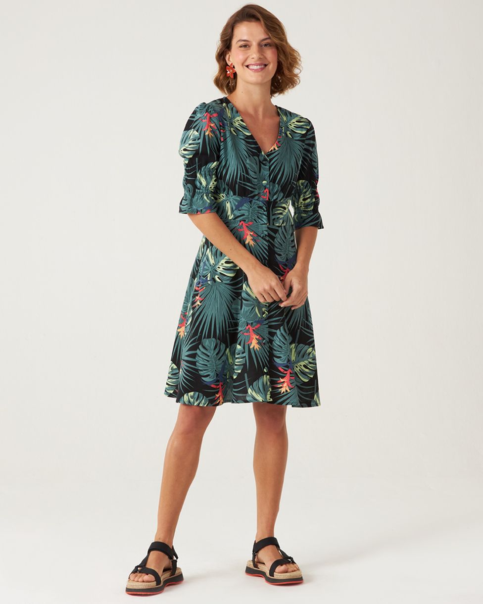 Vestido Feminino Folhagem Botões Frontais Em Viscolinho