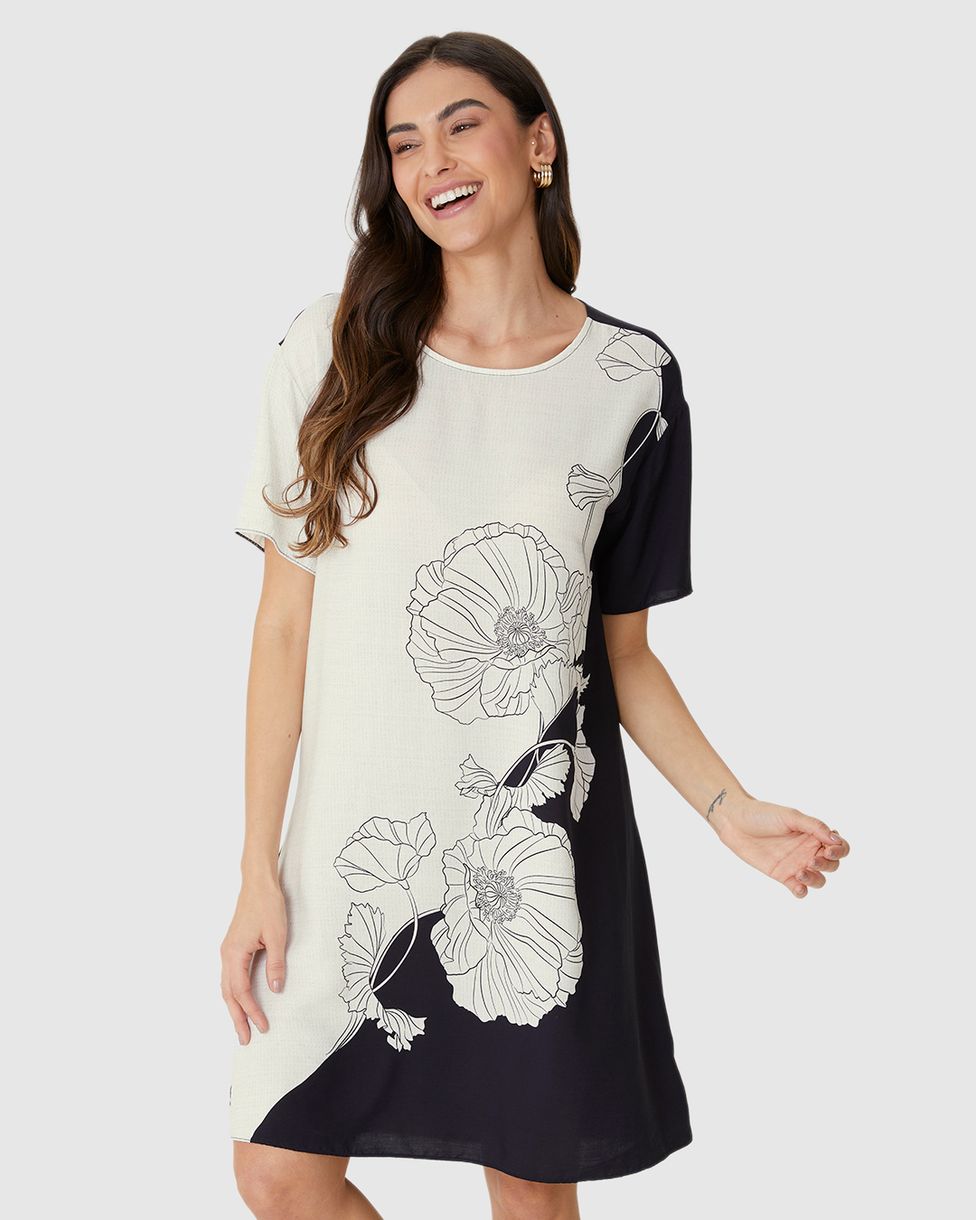 Vestido Feminino Reto Estampado Manga Curta Em Viscose