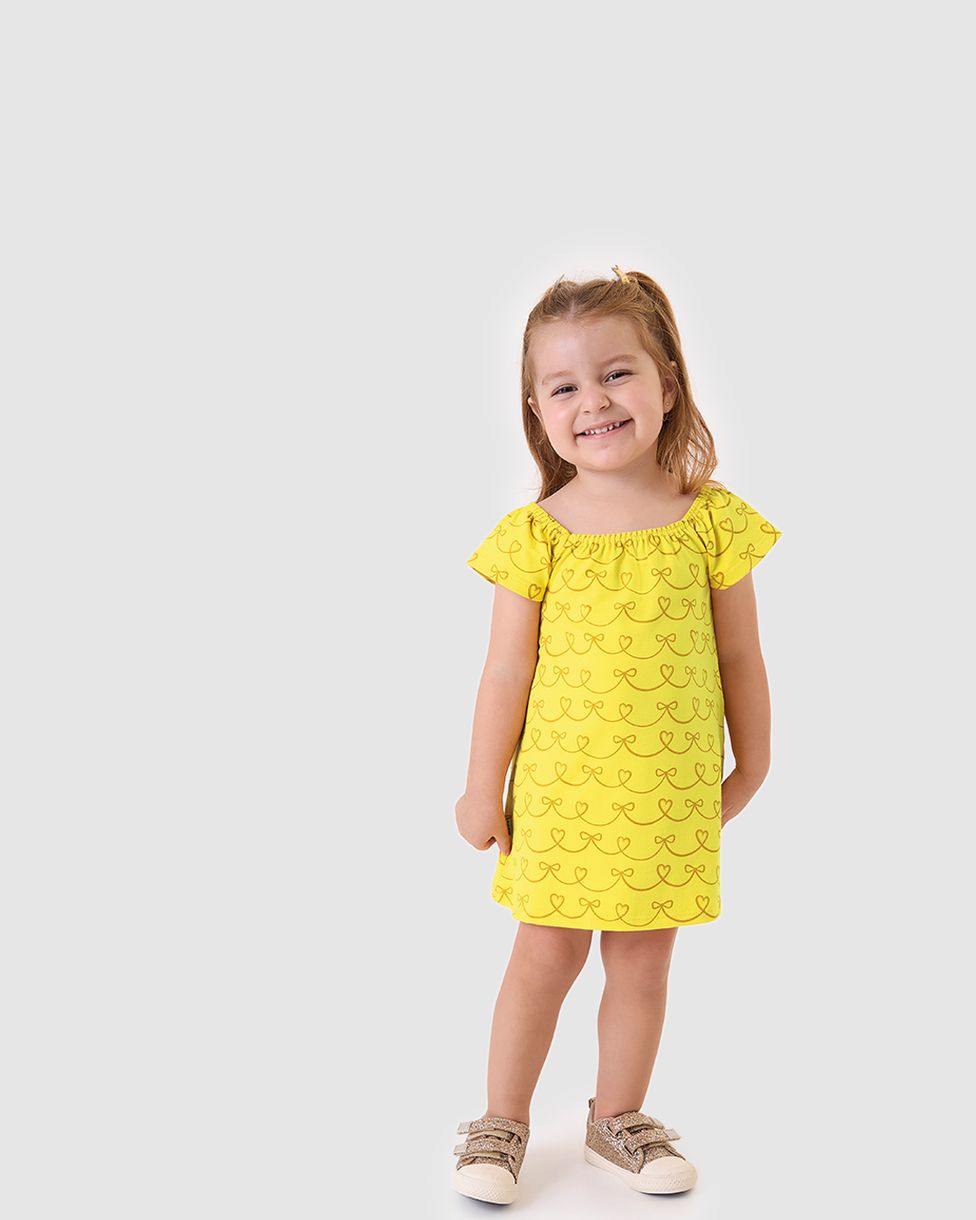 Vestido Infantil Evasê Estampa Coração Em Algodão Malwee Kids Amarelo - 1