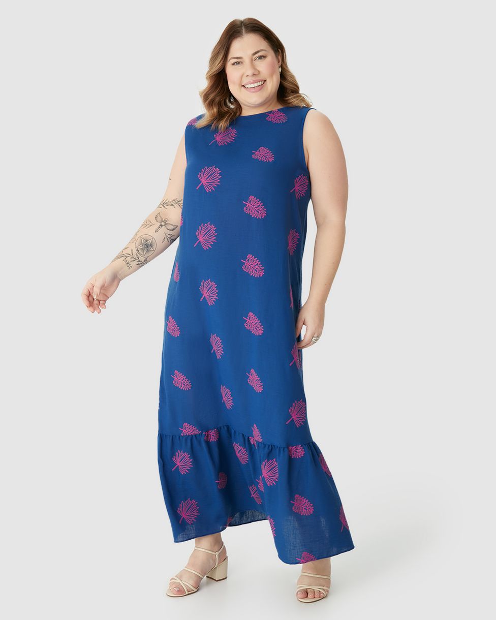 Vestido Longo Feminino Plus Size Evasê Sem Manga Em Tecido Bordado Azul - G1