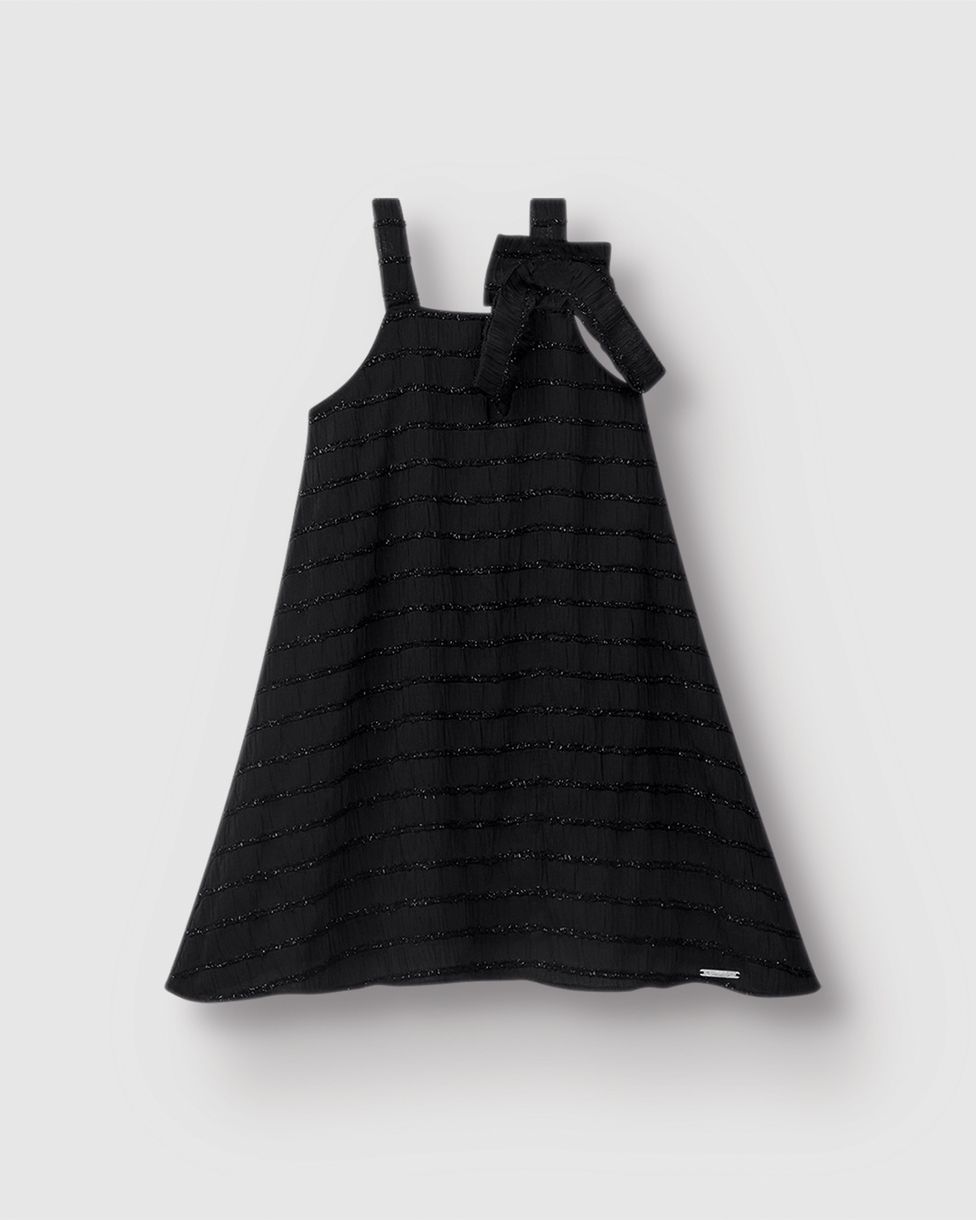 O Vestido Menina Alça Detalhe Laço é a escolha perfeita. Parte da coleção Alto Verão 25, esta peça foi desenhada para oferecer conforto e estilo, ideal para os momentos mais especiais. O tecido listrado com brilho confere um visual sofisticado e divertido, garantindo que sua garota se sinta única em qualquer ocasião.
