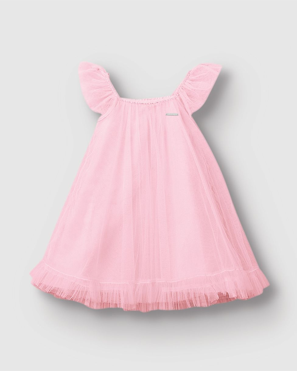 Vestido Menina Evasê Decote Reto E Alças Em Tule - Carinhoso