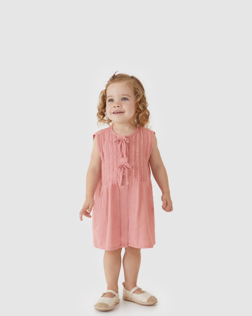 Vestido Menina Evasê Detalhe Laços Frontais Em Jeans Leve - Carinhoso Rosa - 1