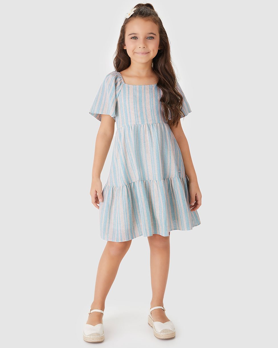 Vestido Menina Rodado Estampa Listrada Em Viscolinho - Carinhoso Azul - 10