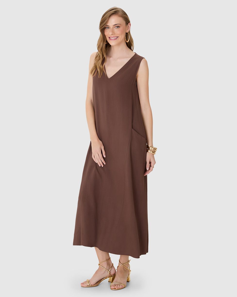 Vestido Midi Feminino Bolso Funcional Em Viscolinho Texturizado