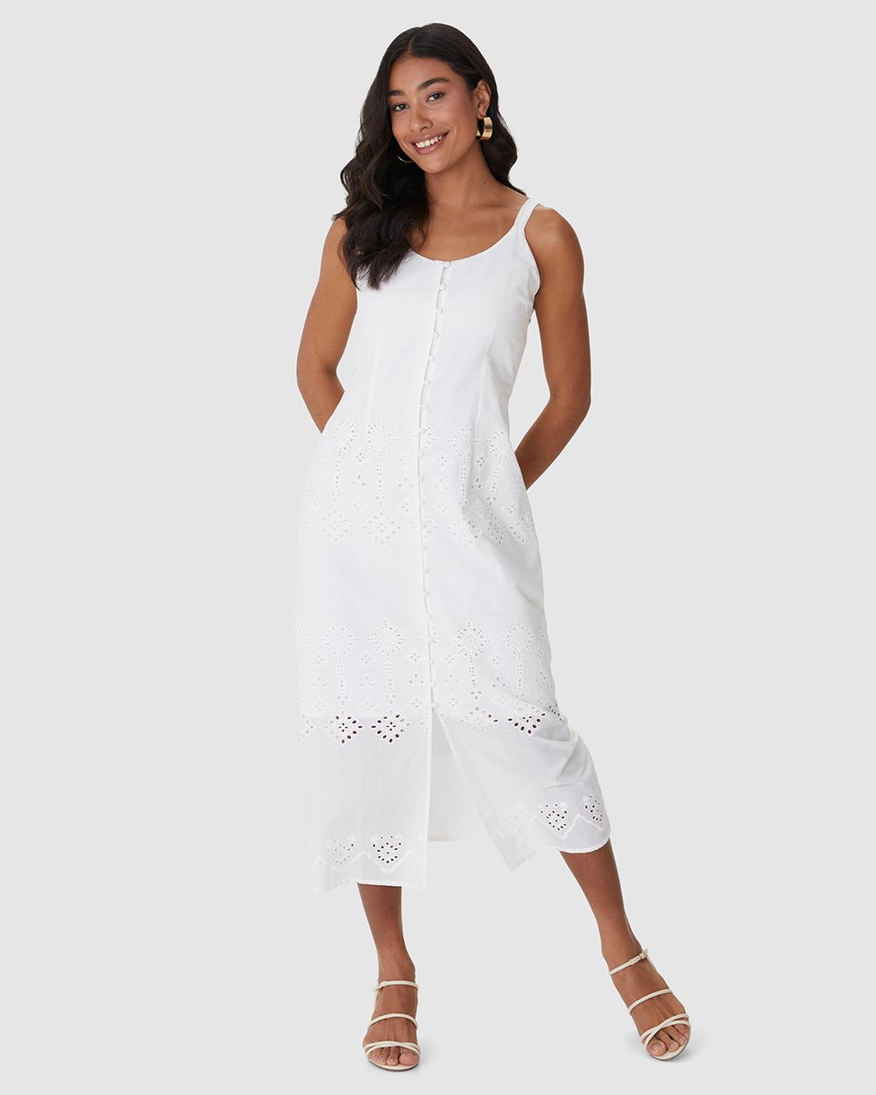 Vestido Midi Feminino Botões Frontais Detalhe Vazado Costas Em Laise Algodão