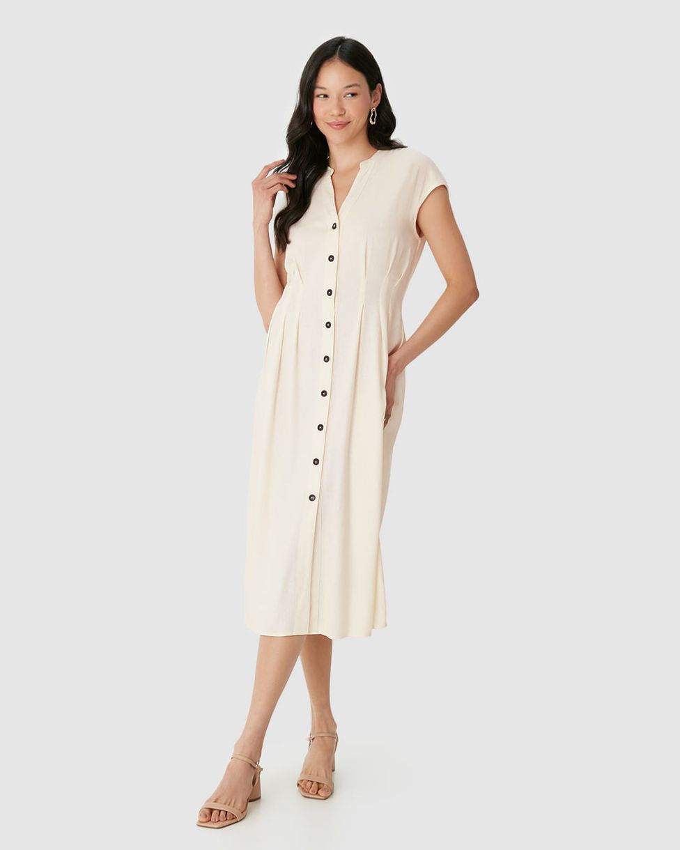 Vestido Midi Feminino Chemise Abotoamento Frontal Em Viscolinho Off White - G