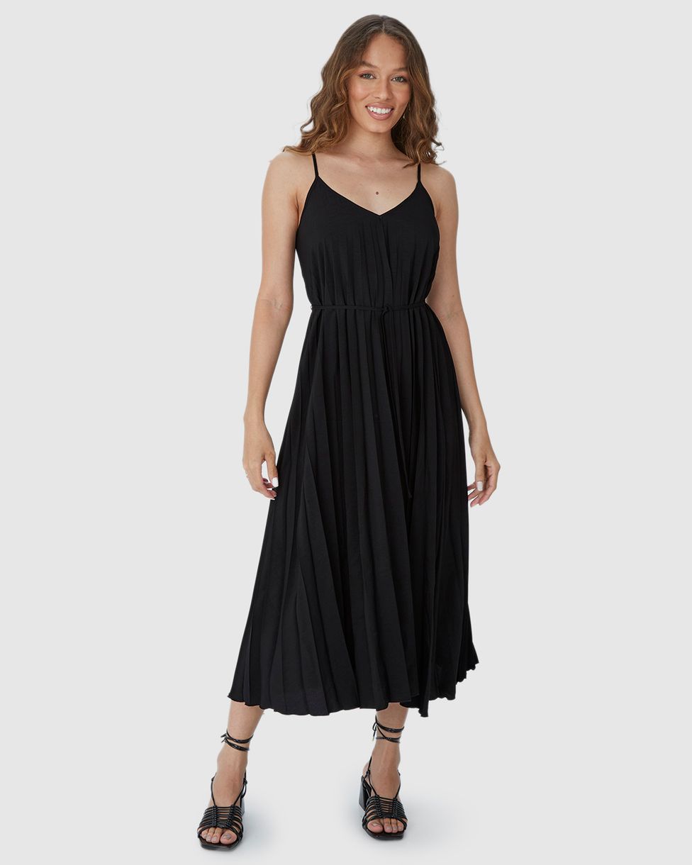 Vestido Midi Feminino Decote V Alça Fina Em Tecido Plissado