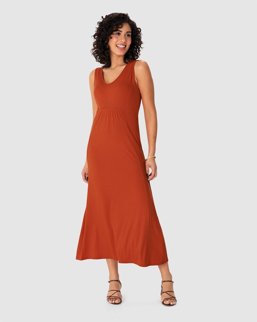 Vestido Midi Feminino Detalhe Franzido Frontal Em Malha Viscose Canelada