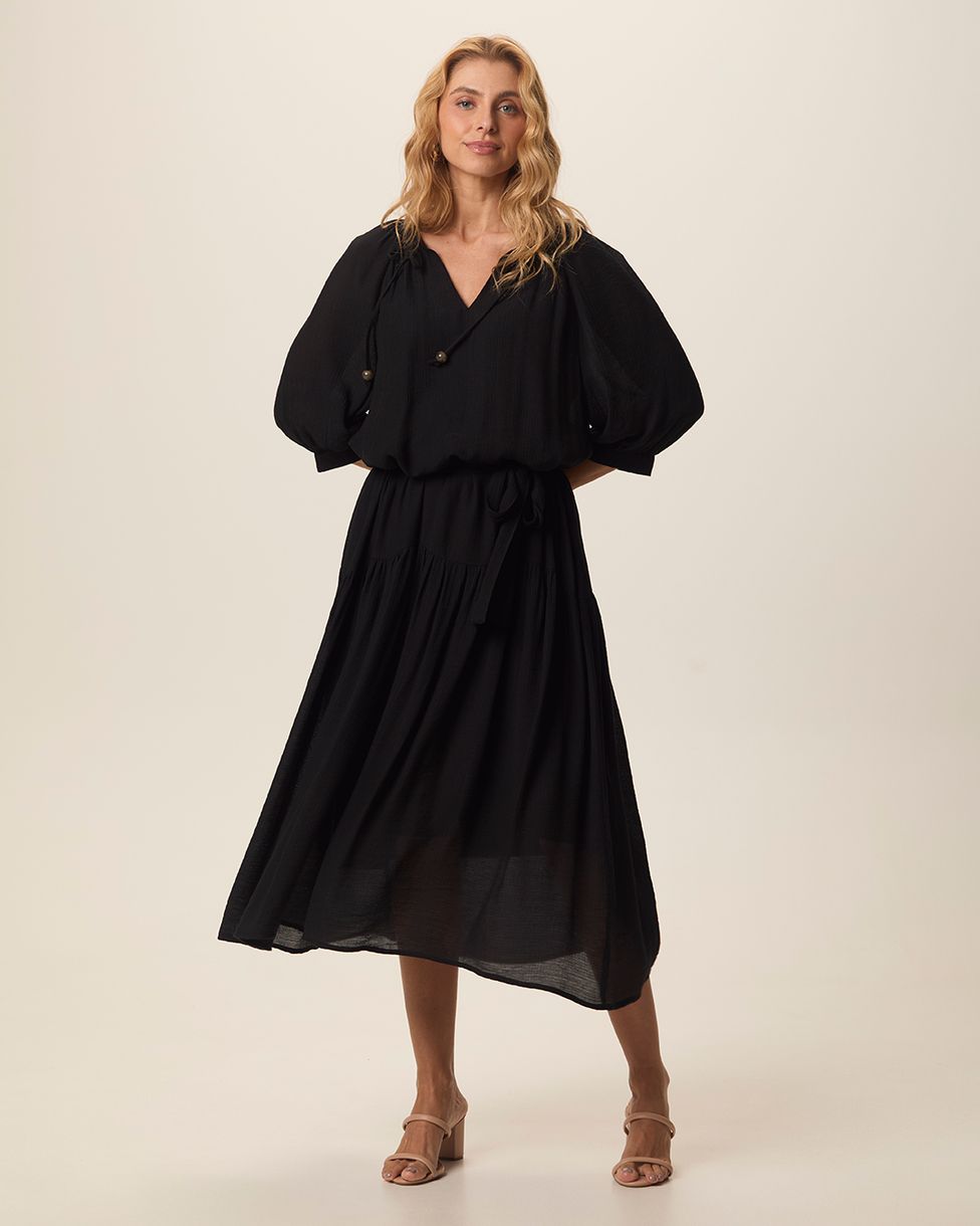Vestido Midi Feminino Evasê Amarração No Decote E Acompanha Cinto Em Crepe Leve Preto - P