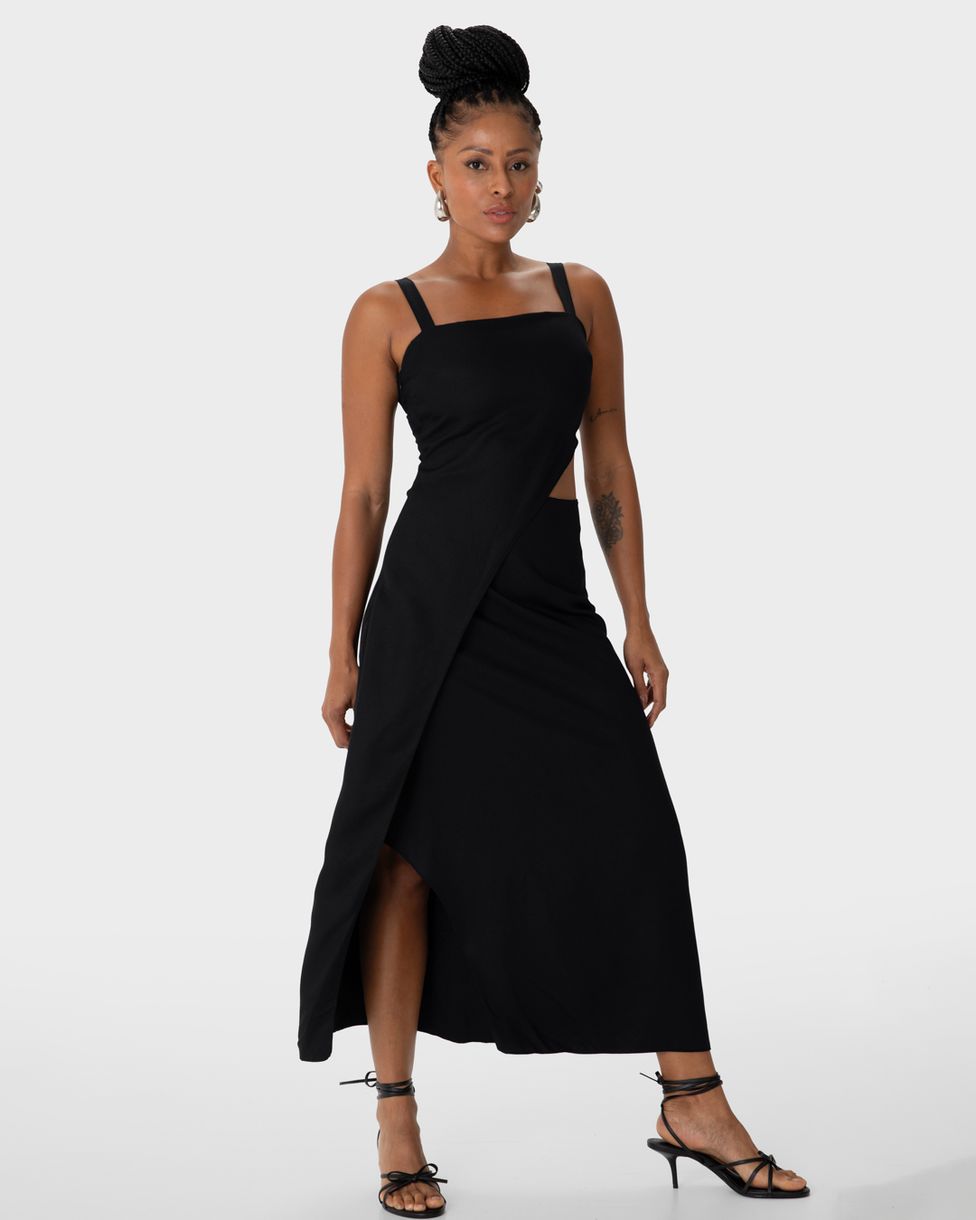 • Decote reto, alça com regulagem e comprimento midi com fenda, para um look elegante e versátil;