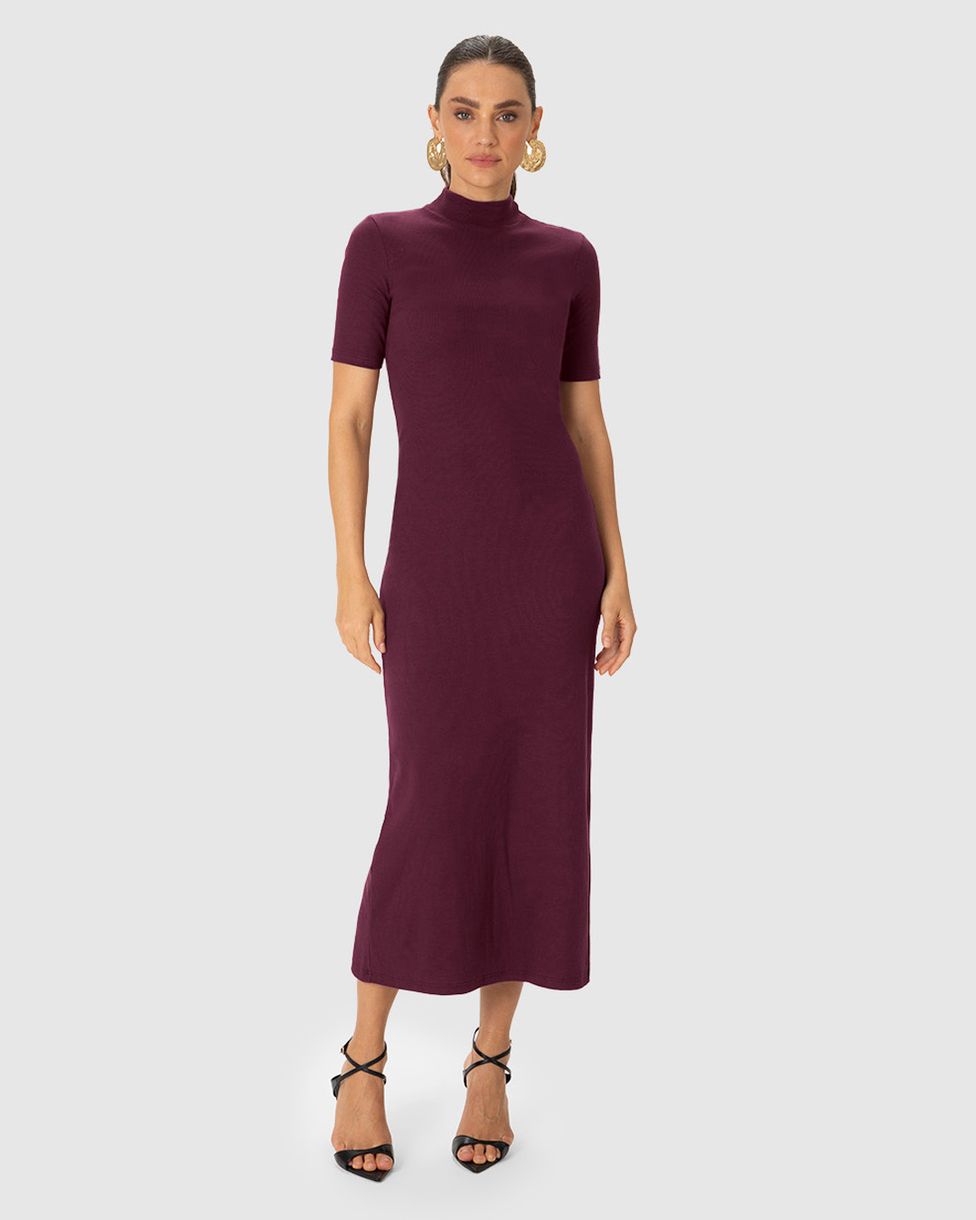 Vestido Midi Feminino Gola Alta Fenda Costas Em Ribana Canelada - ENFIM