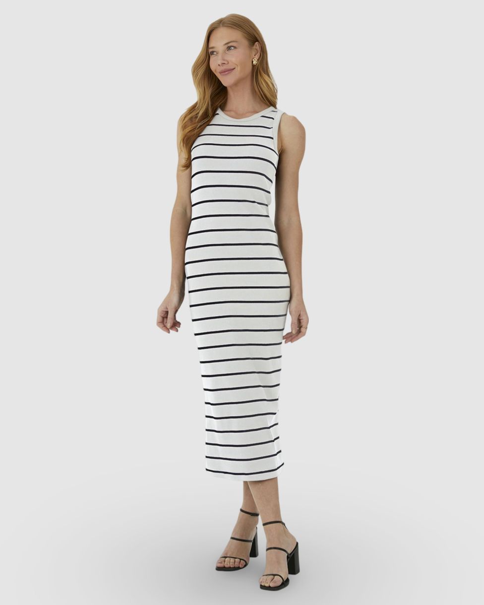 Vestido Midi Feminino Justo Em Ribana Listrada