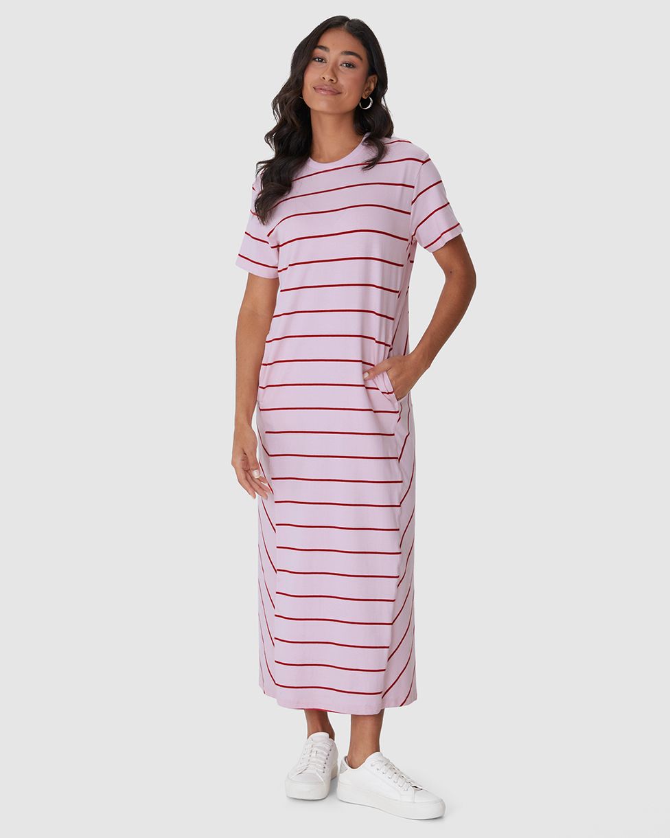 Vestido Midi Feminino Listrado Bolso Funcional Em Malha Algodão Rosa - G