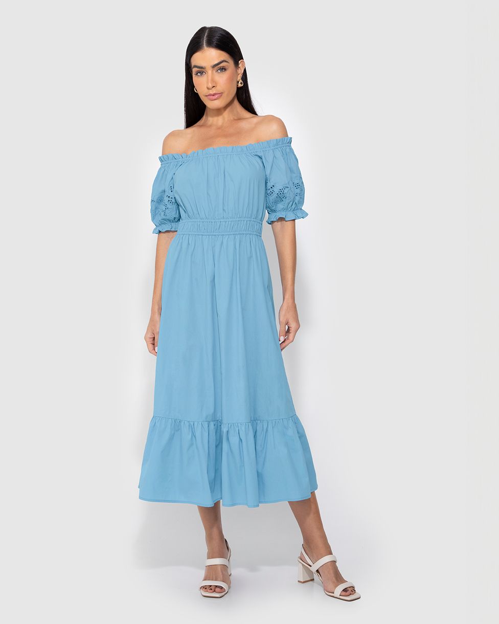 Vestido Midi Feminino Manga Com Bordado Em Tricoline - ENFIM