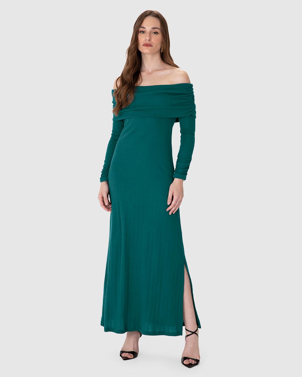 Vestido Midi Feminino Ombro A Ombro Manga Longa Em Tricô Jacquard - ENFIM