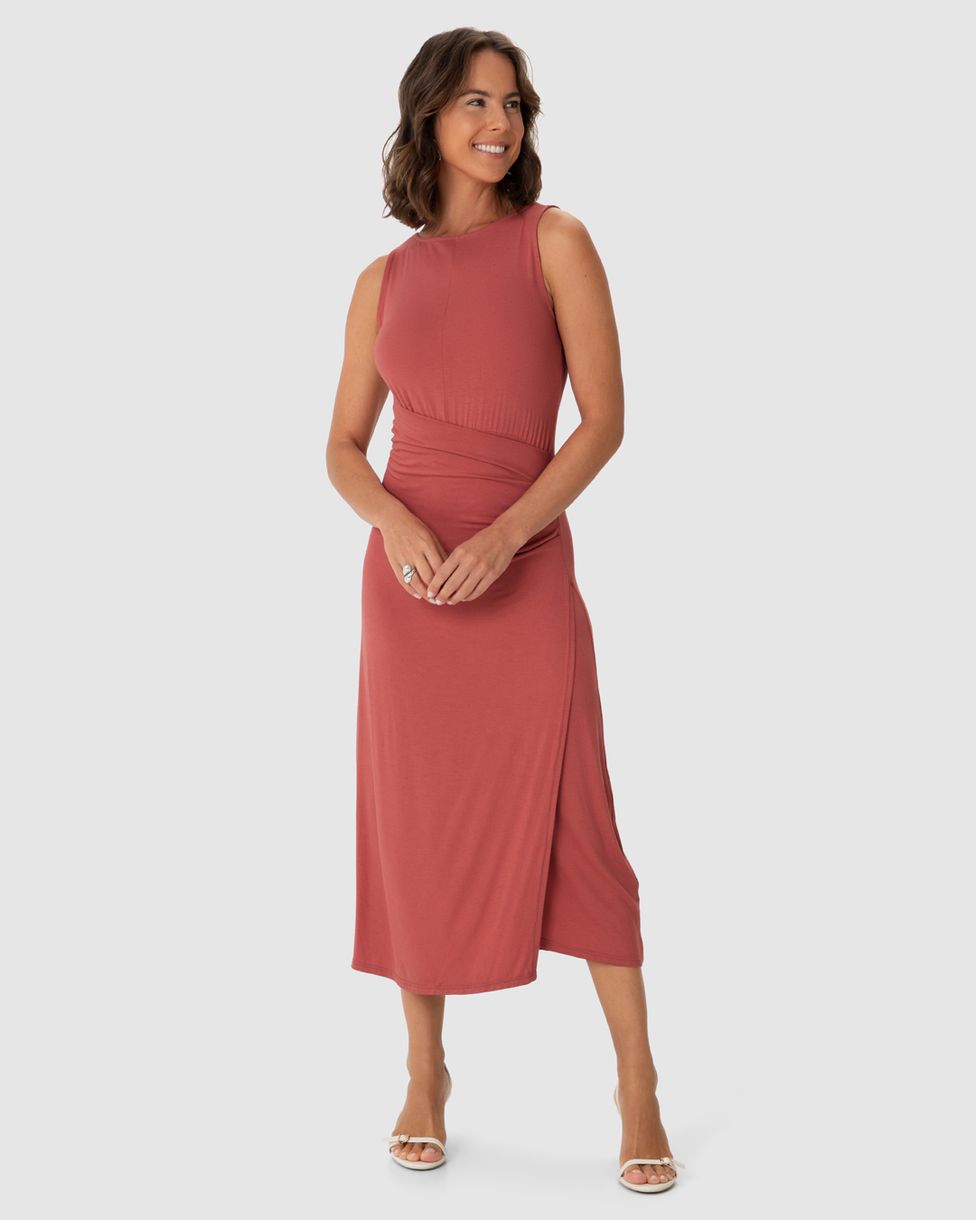 Vestido Midi Feminino Pregas Laterais Em Malha Viscolinho Stretch