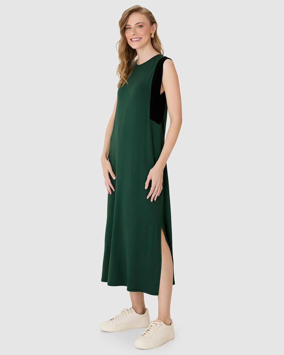 Vestido Midi Feminino Recorte Contrastante E Fenda Em Moletinho De Viscose