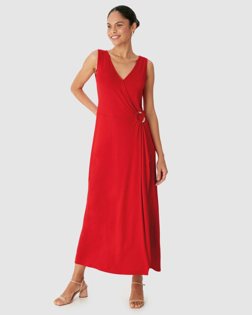 Vestido Midi Feminino Transpassado Detalhe Com Argola Em Viscose Stretch Vermelho - G
